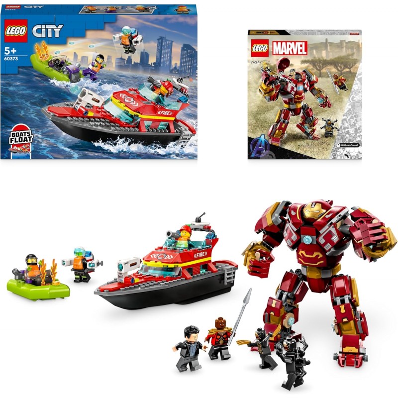 Let kids get ready for an epic roleplaying adventure with this LEGO Hero Bundle including: Marvel The Hulkbuster: The Battle of Wakanda (76247) mech kit and City Fire Rescue Boat (60373) toy set.There is twice as much action and fun to discover with this LEGO Hero Bundle including not 1 but 2 action toy sets that kids can build and play with alone or with their parents or friends.LEGO Marvel The Hulkbuster: The Battle of Wakanda (76247) comes with a buildable Marvel Avengers action figure with locked knee joints to provide stability, plus an opening cockpit with space for the included Bruce Banner minifigure.Also includes the Fire Rescue Boat (60373) set wich features a speedboat, fire rescue toy boats that float on water and a jetpack, plus 3 firefighter minifigures that kids can use to play out sea-rescue stories.This LEGO Hero bundle provides countless hours of building fun and makes a great gift for Easter, a birthday, Christmas or any other day, for boys and girls aged 5+ years old who love action toys.