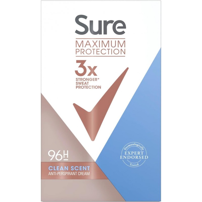 Sure Maximum Protection Clean Scent Anti-perspirant Deodorant Cream Stick is our most powerful protection against sweat and odour in an easy-to-apply, dermatologically tested cream-stick format to keep you feeling fresh, dry and confident for 96 hours. When you are dealing with excessive sweating, you want highly effective and reliable protection that is kind to your skin. This anti-perspirant cream stick is 3x more powerful* on sweat thanks to our active technology and our TRIsolid cream formula is body responsive with a unique blend of skin-moisturising ingredients, so it’s gentle enough for everyday use. Sure’s most powerful strong deodorant forms a protective layer across your sweat glands, tackling odour from the source. With Sure's innovative MotionSense technology that releases bursts of clean, fresh fragrance, you get total confidence to keep going whatever life throws at you. It works like this: unique microcapsules sit on the surface of your skin. When you move, friction breaks those microcapsules releasing more fragrance. So, the more you move, the more it protects. How to use: Sure Maximum Protection anti-perspirant deodorant stick can be used in the morning or at night. For optimum sweat protection, apply at night when your sweat glands are less active. Twist the bottom to release the cream with two clicks per underarm and smooth onto each underarm evenly. Sure gives you all the backup you need. Sure, it won't let you down. *vs. Sure basic anti-perspirant deodorant aerosol.